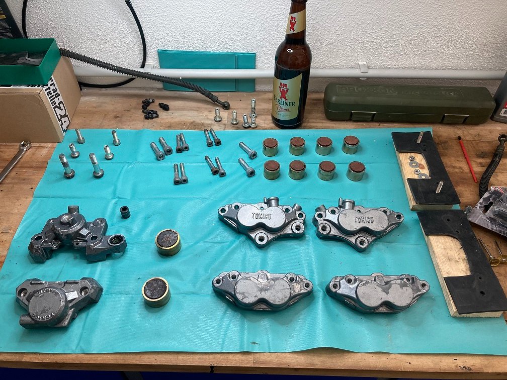 Inzwischen habe ich mich dazu entschlossen, die Bremsanlage im Winter komplett zu überholen und dabei gleich auf Stahlflex-Leitungen umzurüsten. Die Leitungen sind auch schon da. Also kann das Komplettprogramm fast starten mit Ultraschallbadreinigung, Dichtungserneuerung usw...