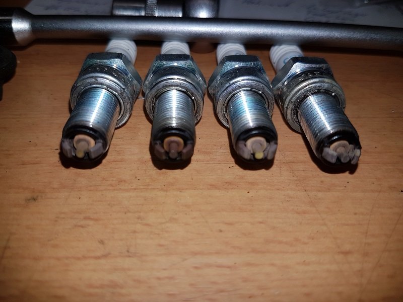 Die Krümmerthemperatur ist niedriger als bei den anderen Zylindern und der Krümmer hat innen eine andere Farbe der Verbrennungsrückstände. Daher gab es neue Kerzen.