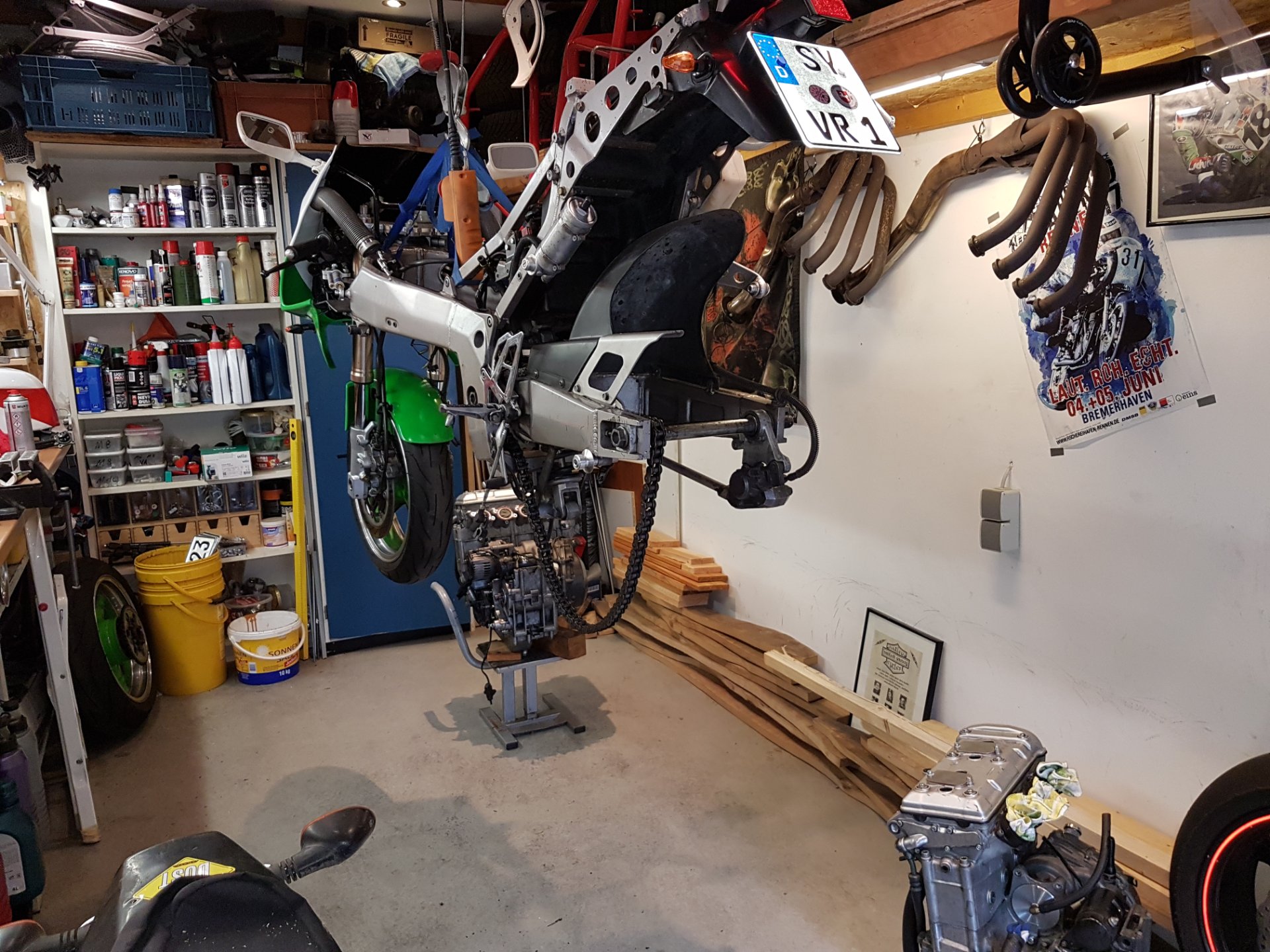 Der 9ér und der alte Rennmotor liegen auf der Werkbank und warten auf die Reparatur...