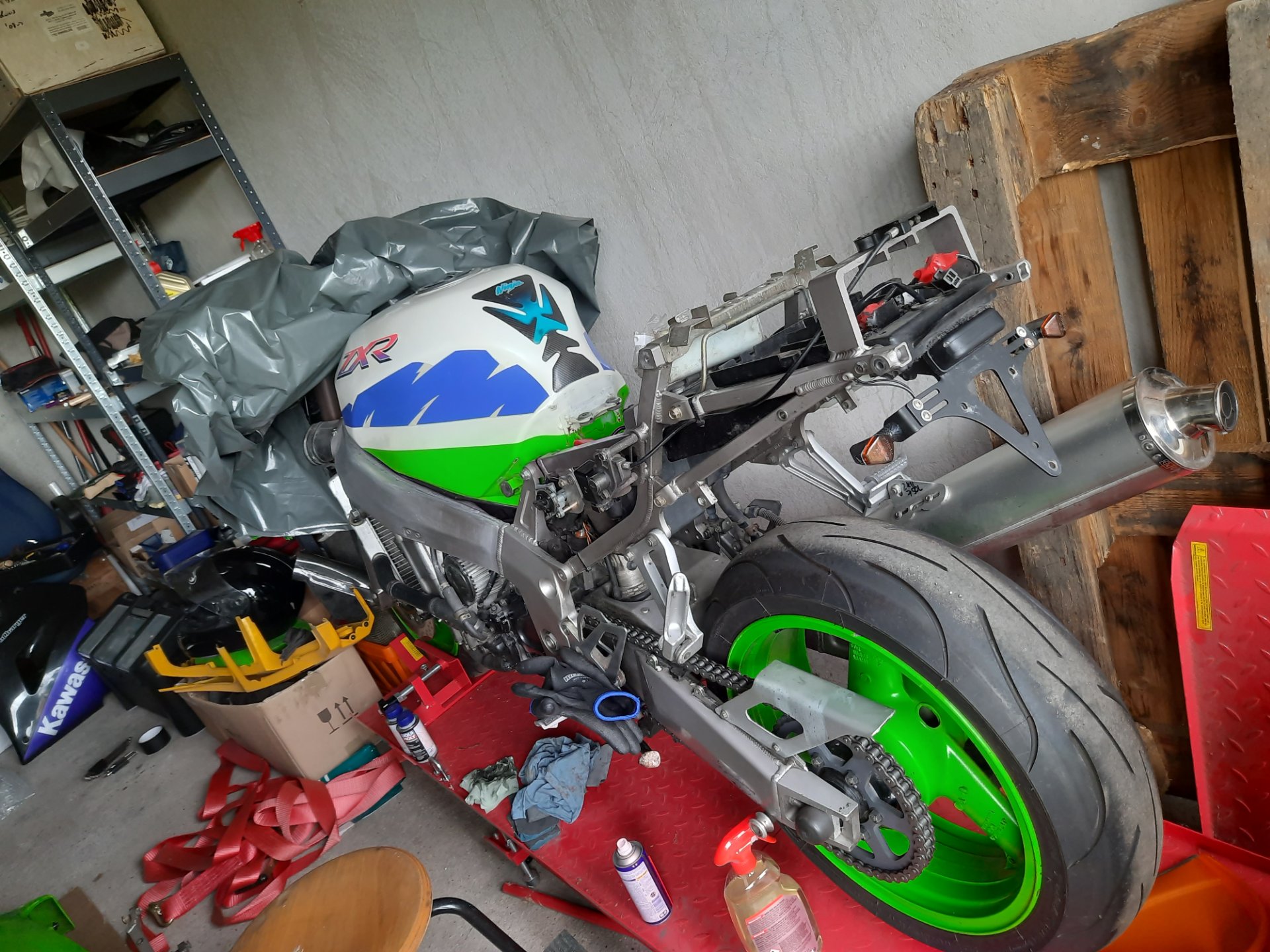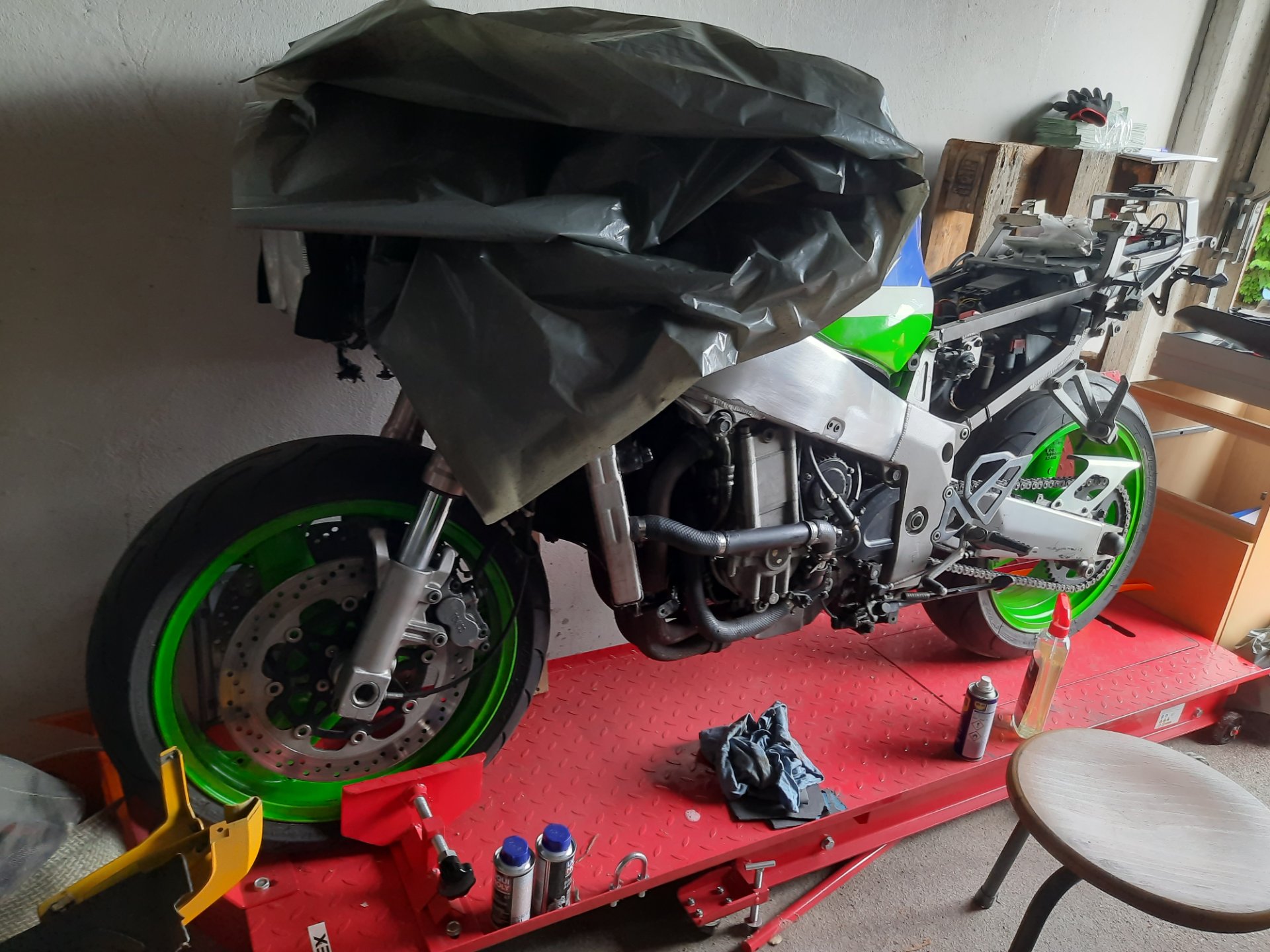 Beim Zusammenbau liegt eine komplette Carbon-Ansaugung und eine Titan-Akrapovic bereit.