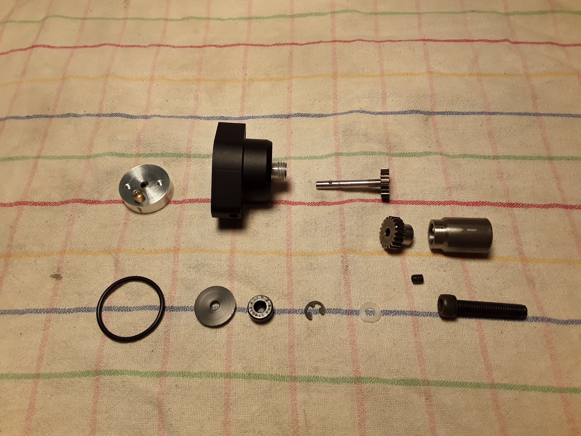 Hier die Explosionszeichnung Oben ist der Schleifkontakt, Gehäuse mit Flansch, Welle mit Zahnrad. Darunter das Zahnrad und der Halter für die Walze. Unten die Dichtung, Wellendichtring und die Befestigungen.