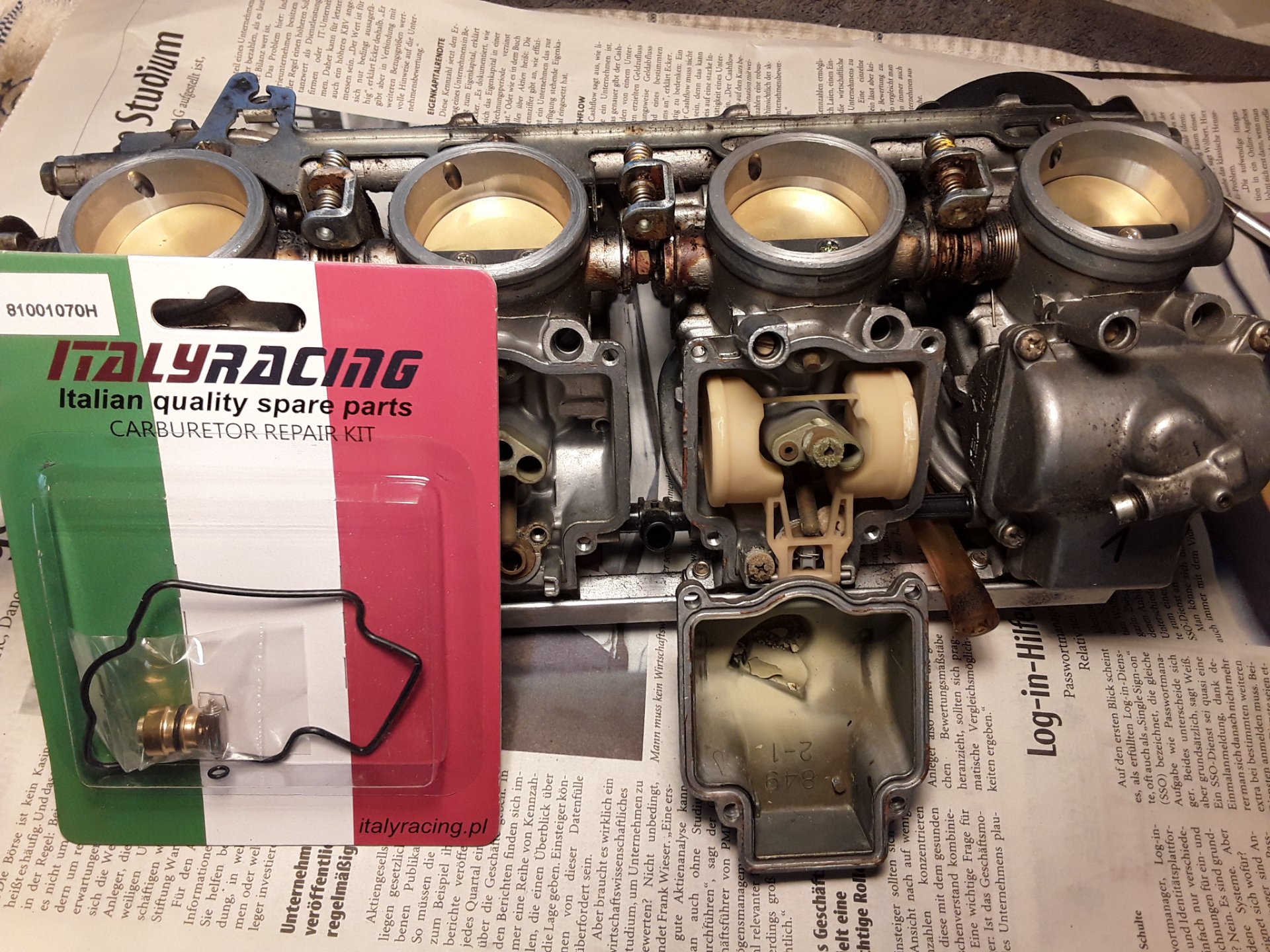 Beim Zerlegen war ein Gasschieber runtergefallen und die Membran beschädigt. Neue Membran von wömbi. Leider fester und schwerer als die originalen, was mir nicht gefiel. Also gebrauchte Vergaserbank. Membranen alle ok und originale Nadeln und Düsen drin.