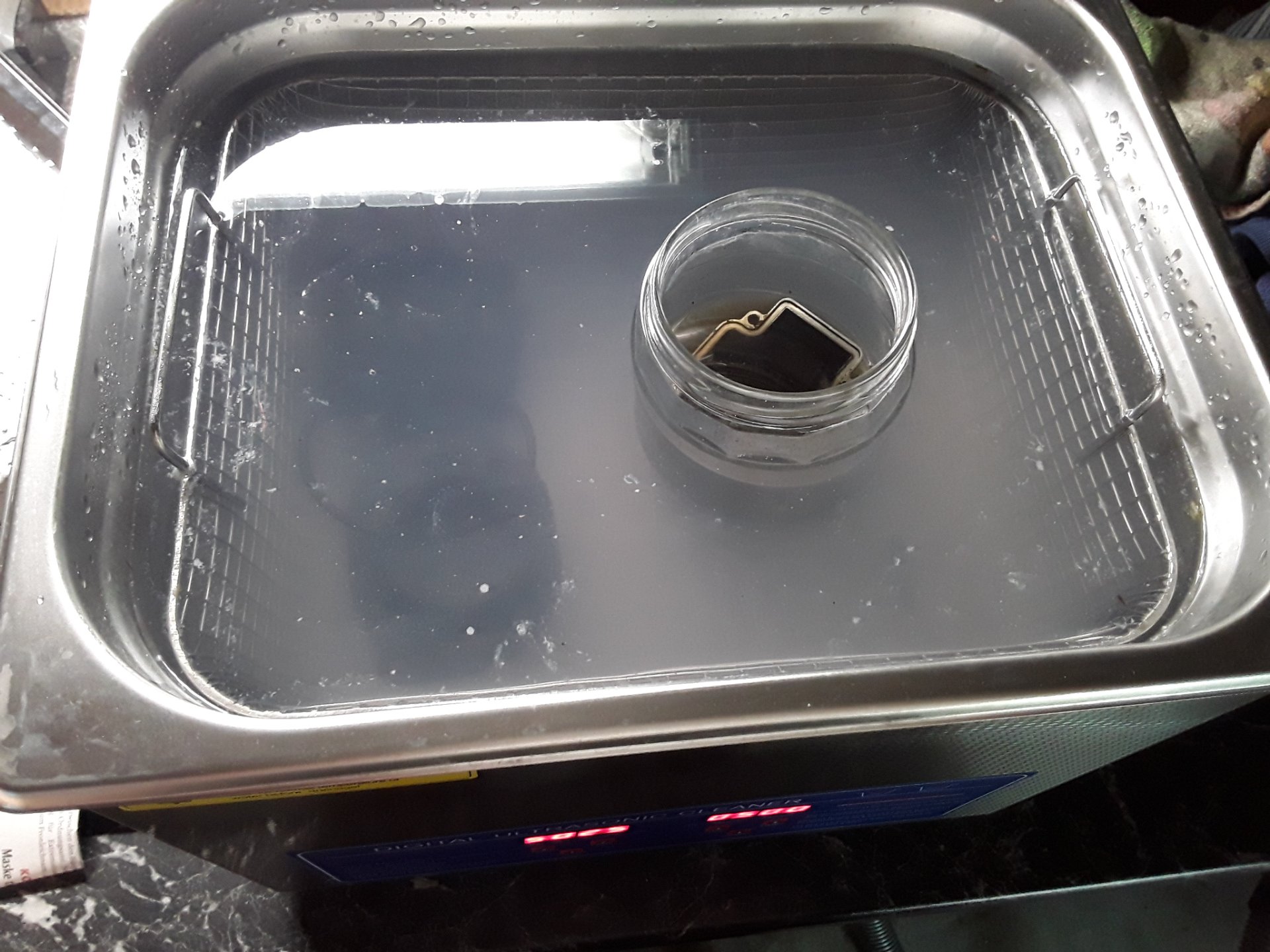 Kleinteile in einem separatem Glas, um Reiniger zu sparen oder schneller wechseln zu können ohne alles abzulassen. Plastikbecher oder Tüten etc führten bei mir zu weniger Ultraschallwirkung.