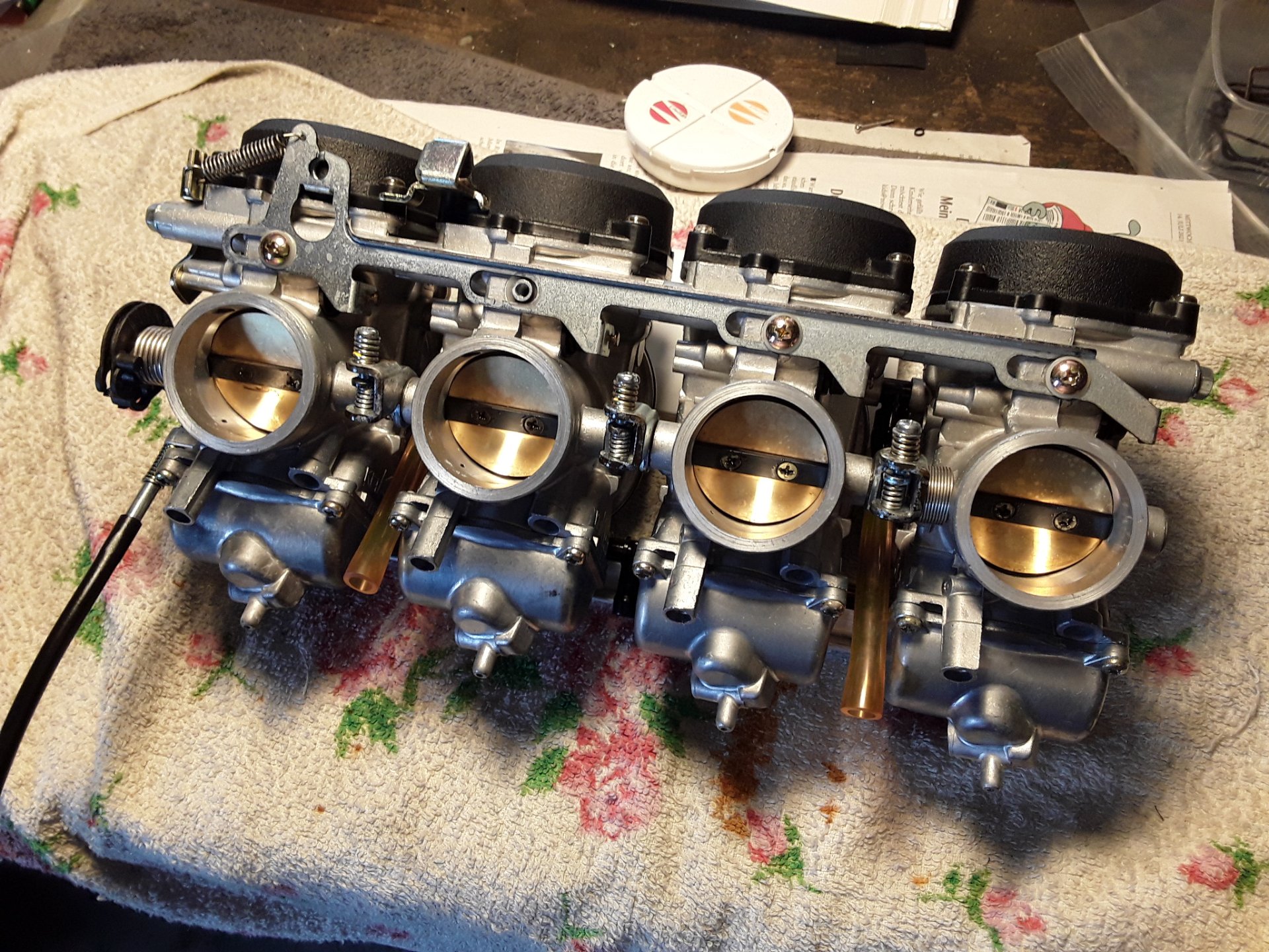 Beim Zerlegen war ein Gasschieber runtergefallen und die Membran beschädigt. Neue Membran von wömbi. Leider fester und schwerer als die originalen, was mir nicht gefiel. Also gebrauchte Vergaserbank. Membranen alle ok und originale Nadeln und Düsen drin.