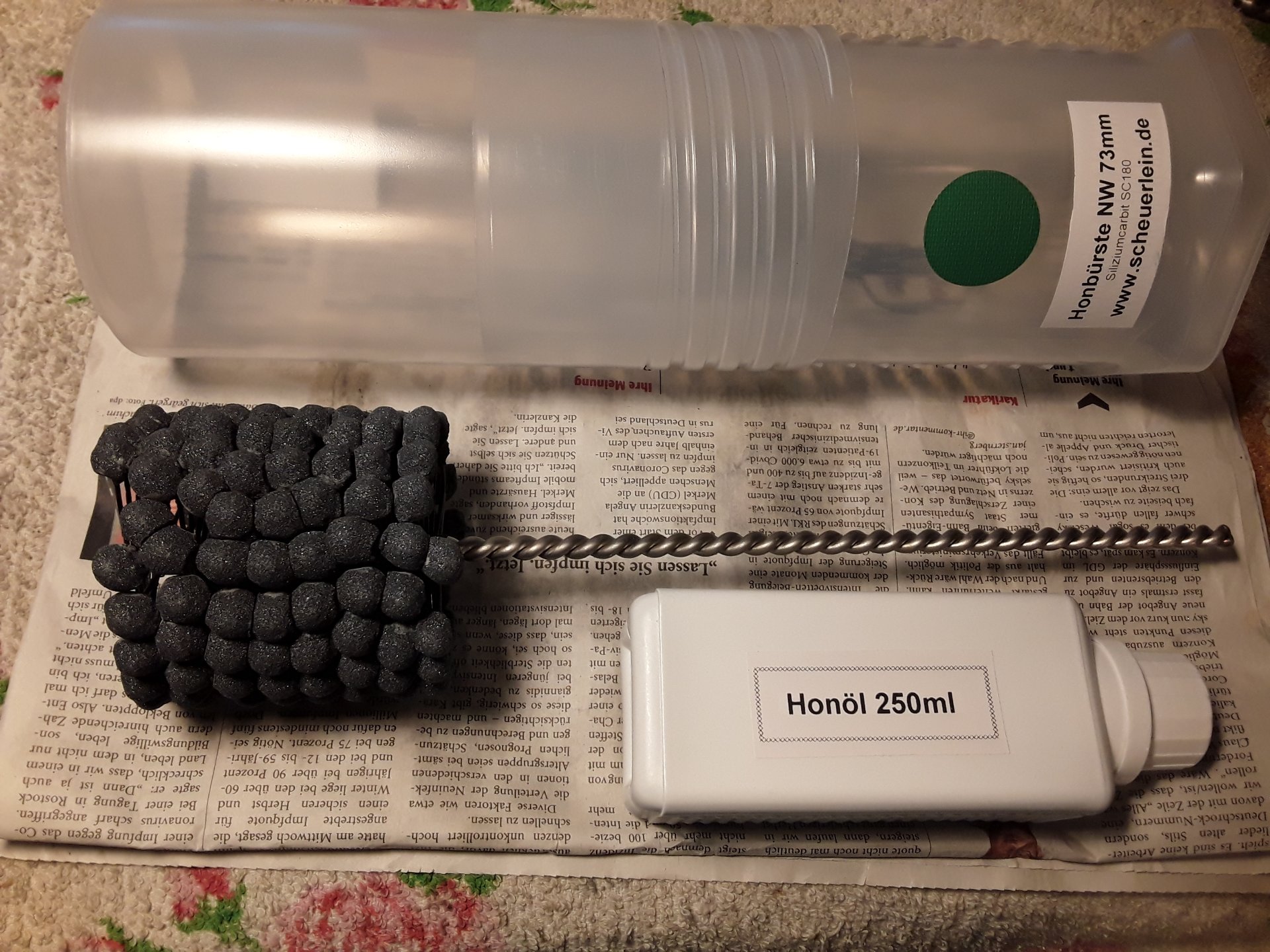 Habe es noch nie gemacht, aber es hat gut geklappt. Habe mit dem älteren Reservezylinder angefangen, erstmal nur 5 Hübe pro Zylinder, damit es gleichmäßig wird solange die neue Bürste noch einschleift. Wenn man es noch nie gemacht hat, würde ich mit einer brandneuen Bürste nicht sofort versuchen, einen Zylinder komplett fertig zu machen. Man sollte nicht ewig darin rumschleifen. Beim guten Zylinder haben dann 10-12 Hübe gereicht, da sollten die Bürste und der Rhythmus gleich passen.