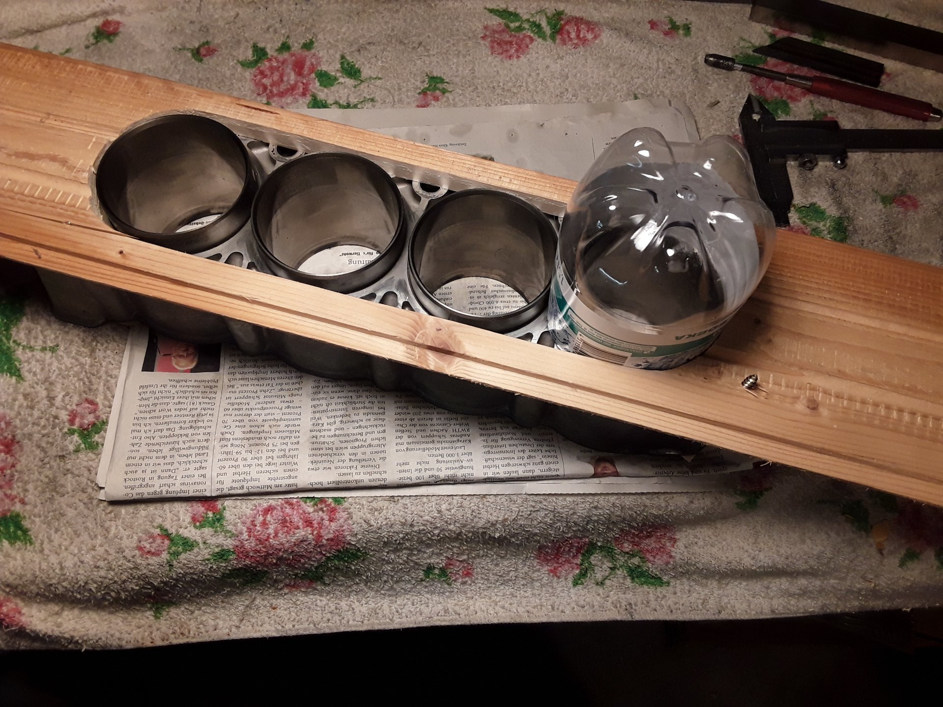 Man kriegt es mit den Fingern hin, aber weil ich immer wieder die Kolbenringe verdreht habe, hab ich aus 70er Abflussrohr was noch rumlag und zwei Rohrschellen Spannbänder gemacht und die Ringe komprimiert. Ging gut.